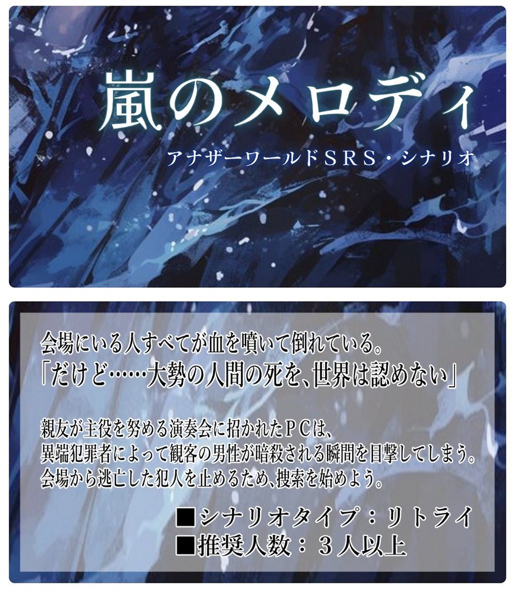 ★ 『嵐のメロディ』・TALTOで公開中 └リプレイ『嵐のメロディ』より └タイプ:リトライ キーワード「将来への夢/音楽/英霊」 └※シナリオ管理シート「嵐のメロディ」 └オリジナルPDFデータ「嵐のメロディ.pdf」 公開1作目 2024.7.14/製作者:マーサー |