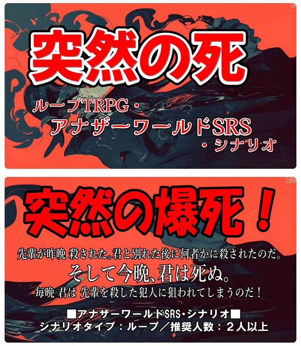 ★ 『突然の死』・TALTOで公開中 └リプレイ『突然の死』より └タイプ:ループ キーワード「無限の爆死/祖父の遺産」 └※シナリオ管理シート「突然の死」 └オリジナルPDFデータ「突然の死.pdf」 公開2作目 2024.7.30/製作者:桐生 |