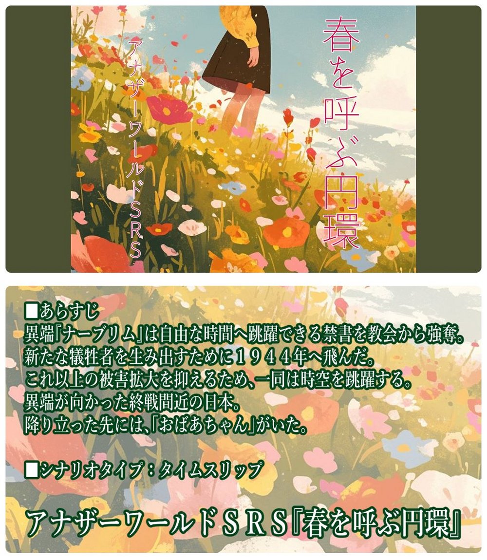 ★ 『春を呼ぶ円環』・TALTOで公開中 └リプレイ『春を呼ぶ円環』より └タイプ:タイムスリップ キーワード「1944年/時を越えて出会う先祖/約束/呪い」 公開3作目 2024.8.3/製作者:マーサー |