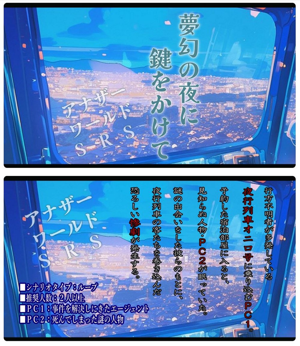 ★ 『夢幻の夜に鍵をかけて』・TALTOで公開中 └リプレイ『夢幻の夜に鍵をかけて』より └タイプ:ループ キーワード「夜行列車/愛する人を蘇らせる/正義の決断/悪夢を断ち切れ」 公開4作目 2024.8.10/製作者:マーサー |