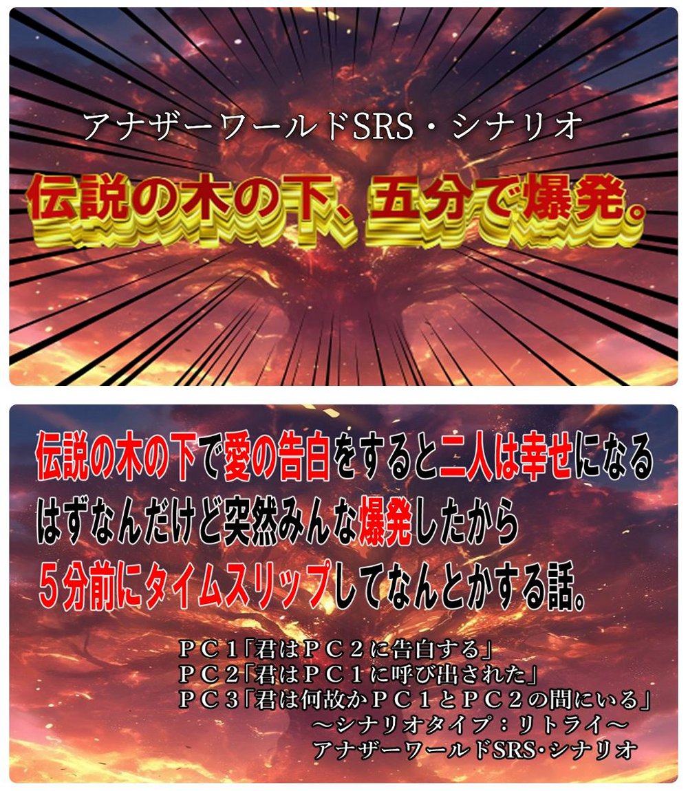 ★ 『伝説の木の下、五分で爆発』・TALTOで公開中 └リプレイ『ラブシックス・ヤー!!』より └タイプ:リトライ キーワード「タイムリミット・5分で爆発/愛の告白」 公開5作目 2024.11.10/製作者:マーサー |