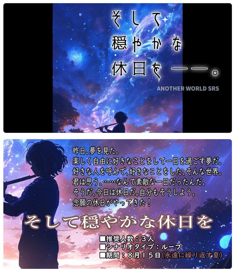 ★ 『そして穏やかな休日を』・TALTOで公開中 └リプレイ『そして穏やかな休日を』より └タイプ:ループ キーワード「自由な休日/エンドレスエイト(終わらない夏休み)」 公開5作目 2024.11.10/製作者:マーサー |