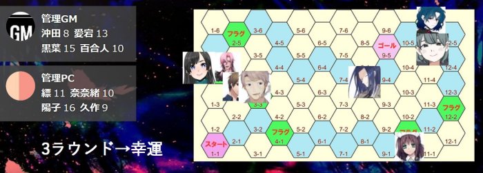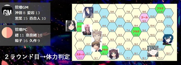 GM/フラグマスに止まったのは、縹と奈奈緒と夢野ですね。という訳で、2ラウンド目は3シーンもします。